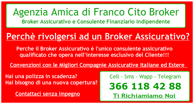 Franco Cito | Broker Assicurativo | Via Brindisi · 130 – 72019 San Vito dei Normanni (BR) Tel: 0831 1 983667 – Cell: 366-118.42.88 – Fax: 0831 1 983667 Iscriz. RUI sez. B N. B000117974 – P.iva: 02415790746 – Autorità competente alla vigilanza sull’attività svolta dall’intermediario: ISVAP Via del Quirinale · 21 – 00187 Roma